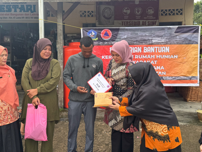 Penerima bantuan itu warga Pengudang, Halim. Halim bersama keluarganya kehilangan tempat tinggal akibat sapuan angin kencang, Minggu 10 November 2025 lalu.
