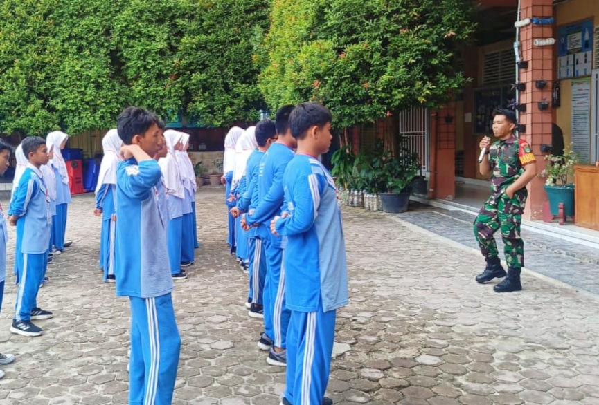 RADARBINTAN.COM, Bengkalis — Anggota Koramil 03/Mandau, Kodim 0303/Bengkalis, Sertu Fikri mensosialisasikan Pancasila kepada siswa sekolah di Kelurahan Babussalam, Kecamatan Mandau, Kabupaten Bengkalis, Sabtu, 22 November 2025.