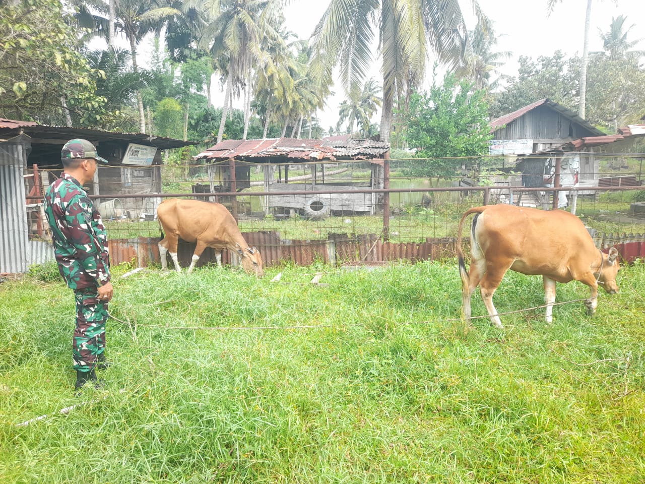 RADARBINTAN.COM, Kabupaten Bengkalis — Anggota Koramil 03/Mandau, Kodim 0303/Bengkalis, Serka Alinaspi melakukan pemantauan gejala Penyakit Mulut dan Kuku (PMK) pada hewan ternak milik masyarakat di Kelurahan Gajah Sakti, Kecamatan Mandau, Kabupaten Bengkalis, Selasa, 02 November 2025.